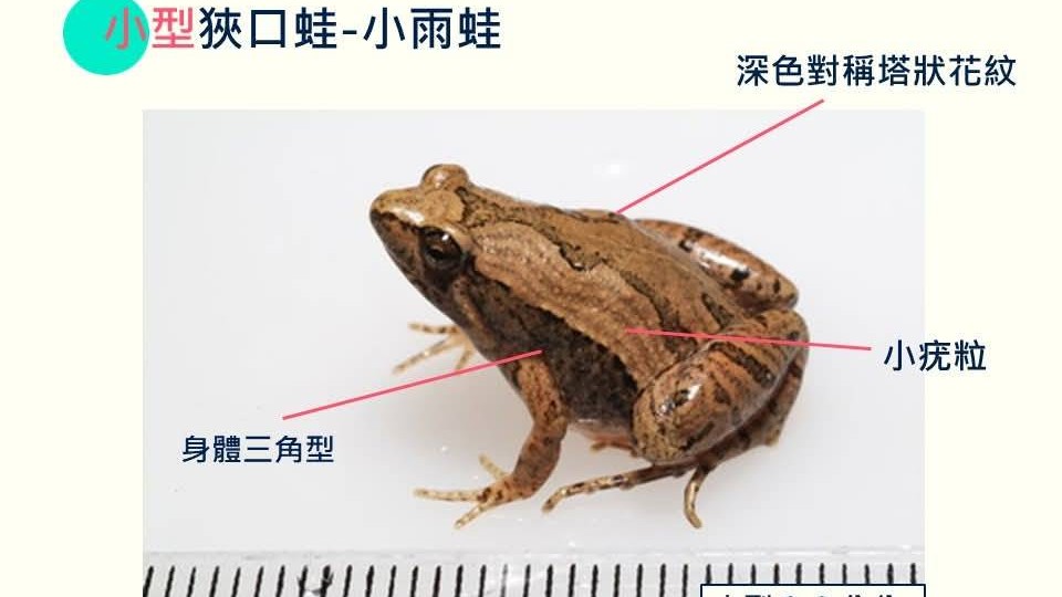 亞洲錦蛙與台灣原生種小雨蛙外型相似,為避免誤判,講師賴俊宏說明如何辨識,亞洲錦蛙體長可達8公分,背部具有花瓶狀花紋,趾端有吸盤,具攀爬能力;台灣小雨蛙體型較小,無吸盤。