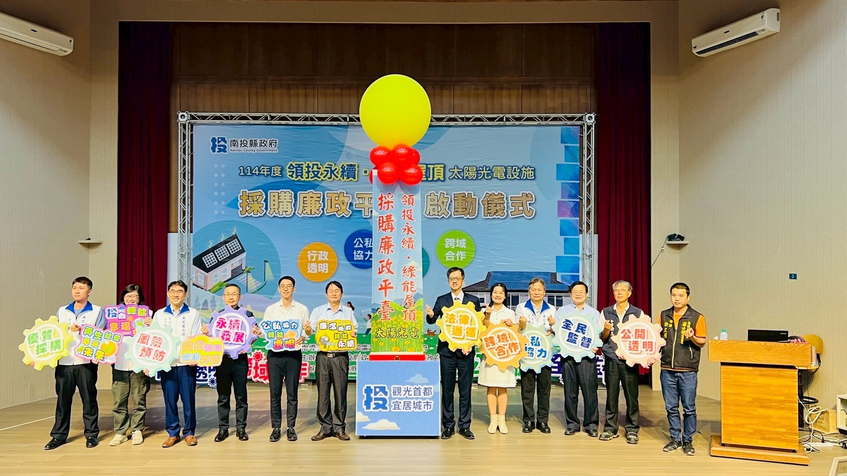 (特派員廖廣學 南投報導)縣府日前在縣府7樓國際會議廳舉辦「領投永續•綠能屋頂」太陽光電設施採購廉政平臺啟動儀式,由縣府代理秘書長簡青松、法務部廉政署中部地區調查組組長劉俊杰、臺灣南投地方檢察署肅貪執行小組祕書蘇厚仁檢察官、法務部調查局南投縣調查站副主任莊宏偉、行政院公共工程委員會研究員鍾佩真、縣府建設處、農業處、計畫處、政風處及採購中心等單位主管,共同完成採購廉政平臺之啟動,啟動儀式圓滿完成。