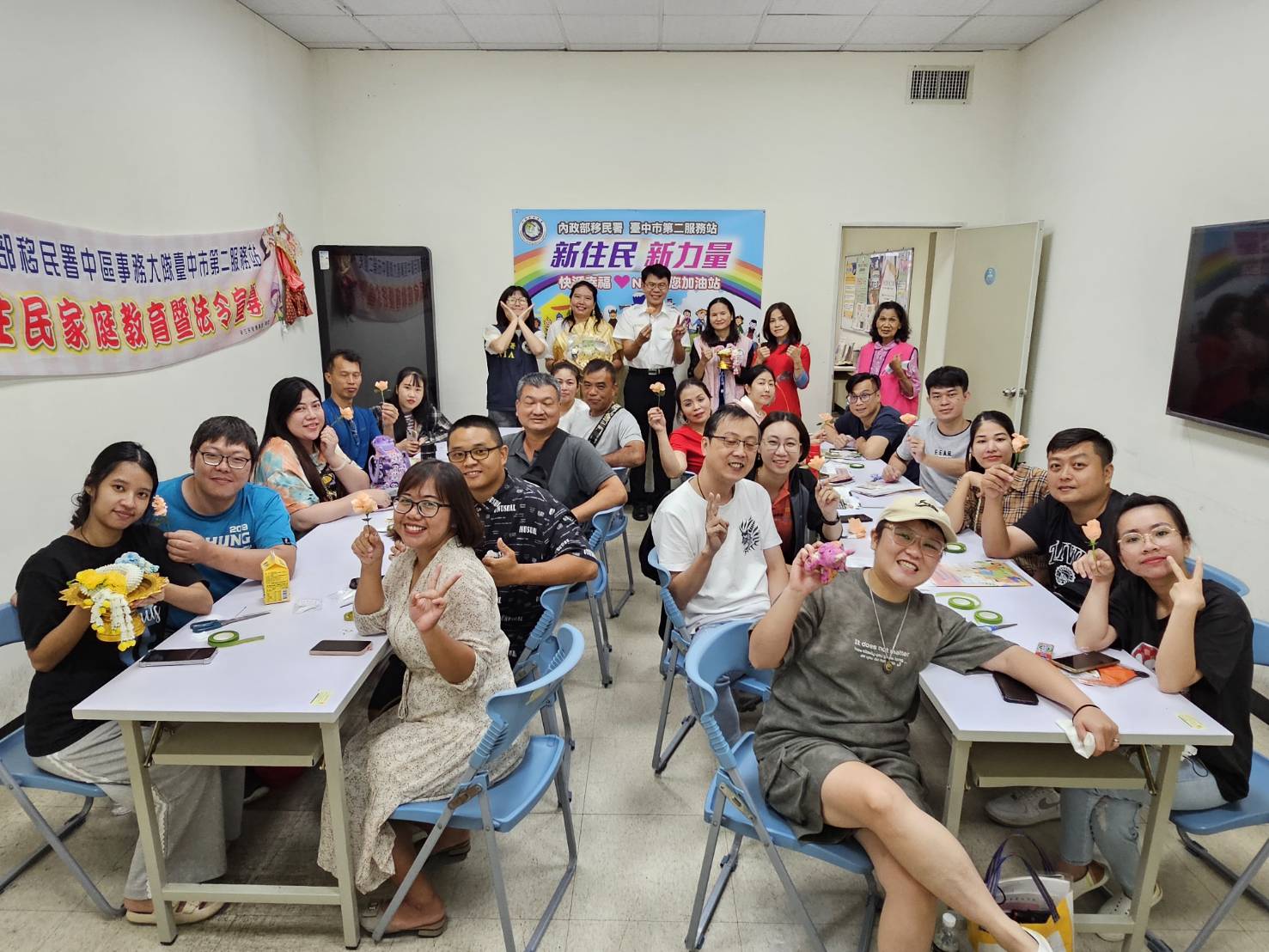 (特派員廖廣學 台中報導) 八月是感恩父親的月份,移民署臺中市第二服務站 13 日於站內舉辦幸福家庭教育課程,邀請泰國籍講師莊汶樺,帶領多對新住民夫妻體驗手作泰國紙花,藉由花朵傳遞對父親與家人的感恩與祝福。活動不僅讓夫妻在製作過程中增進情感、交流文化,也結合廉政宣導,透過溫馨故事提醒民眾「感謝公務員不必送」,避免好意變成困擾,共同守護公平、公正、廉潔的服務環境。