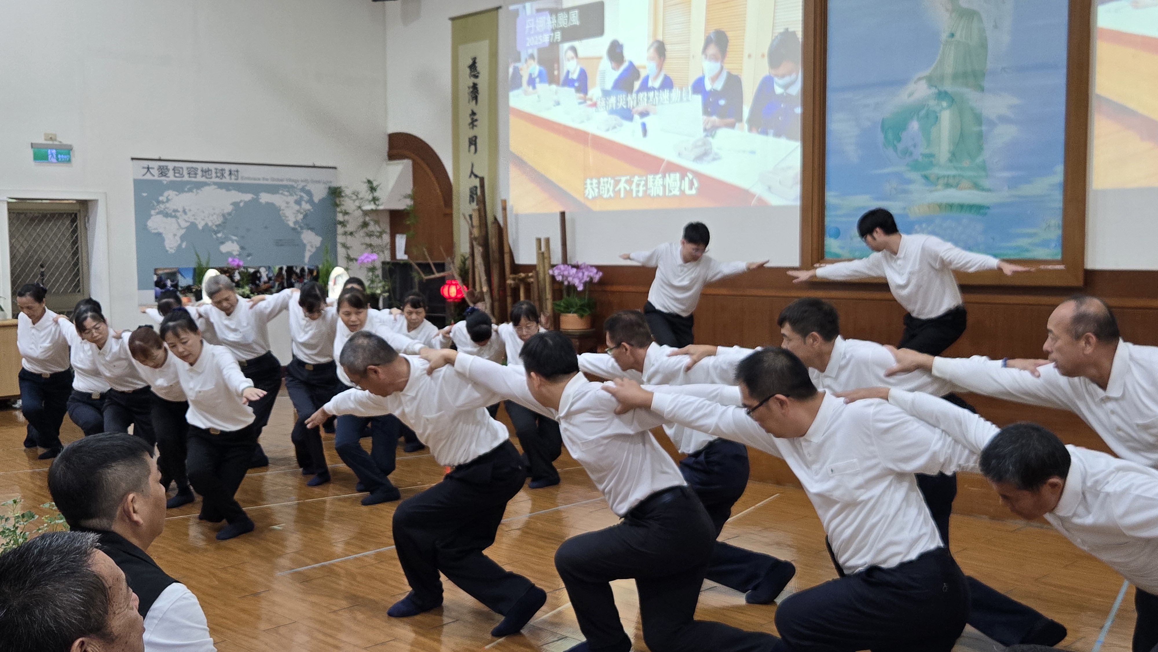 ( 記者邱暐茹 南投報導)南投慈濟2025年舉辦多場七月吉祥月祈福會,首場24日在慈濟草屯聯絡處與南投聯絡處舉行,縣長許淑華率縣府人員出席兩個場地與民眾一起祈福,祈禱國泰民安、風調雨順。草屯鎮公所簡賜勝鎮長帶領各村里長以虔誠的心獻供素菜、與佛對話。