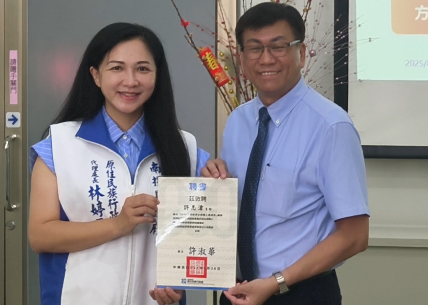 南投縣政府原民處26日,在南開科技大學舉辦「2025年南投縣原風流水席總舖師培訓課程」開業式,由原民處代處長林婷玉到場頒發講師聘書,透過55小時的專業培訓,協助已具備「南投原創烤大豬巴布」認證的職人們,進一步學習融合原住民族文化特色的流水席料理技藝,為南投原鄉餐飲業者開創更寬廣的事業發展空間。