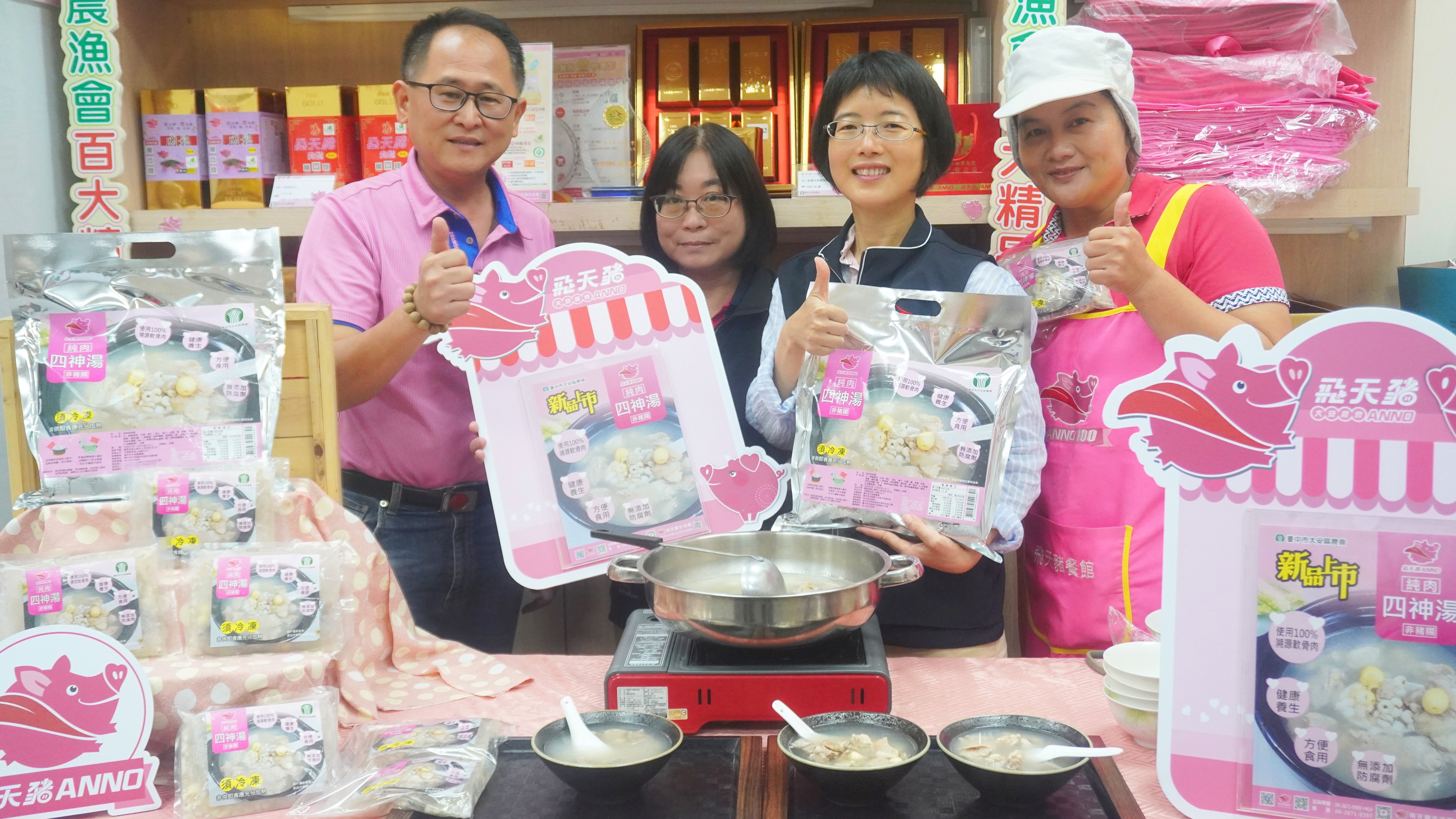 (特派員廖廣學 台中報導) 臺中市大安區農會29日再臺中市大安區農會舉辦新品發表會,推出旗下知名品牌「飛天豬」,正式推出全新養生即食湯品--飛天豬四神湯,四神湯主打「古法煉湯,現代溫補」,將傳統中華食補智慧與現代食品科技完美結合,為忙碌的現代人帶來高蛋白、營養加分的日常溫補選擇,臺中市政府農業局宋佳錡也至現場品嚐。