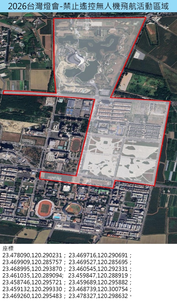 【特派員林昱宏嘉義縣報導】「2026台灣燈會」將於3月3日至3月15日在嘉義縣盛大舉行,預期吸引大量人潮。為維護活動期間公共安全及整體維安需求,嘉義縣政府建設處已於燈會會場及周邊區域劃設遙控無人機飛行管制範圍與時段,呼籲空拍機玩家及民眾務必遵守相關規定。